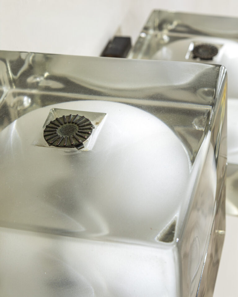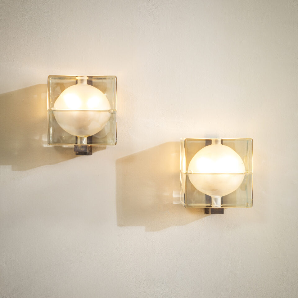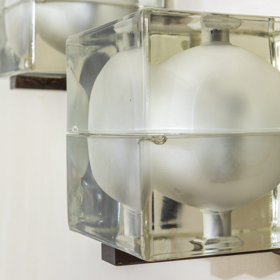 Coppia di applique mod. Cubosfera, diffusore in vetro stampato di forte spessore, disegnato da Alessandro Mendini