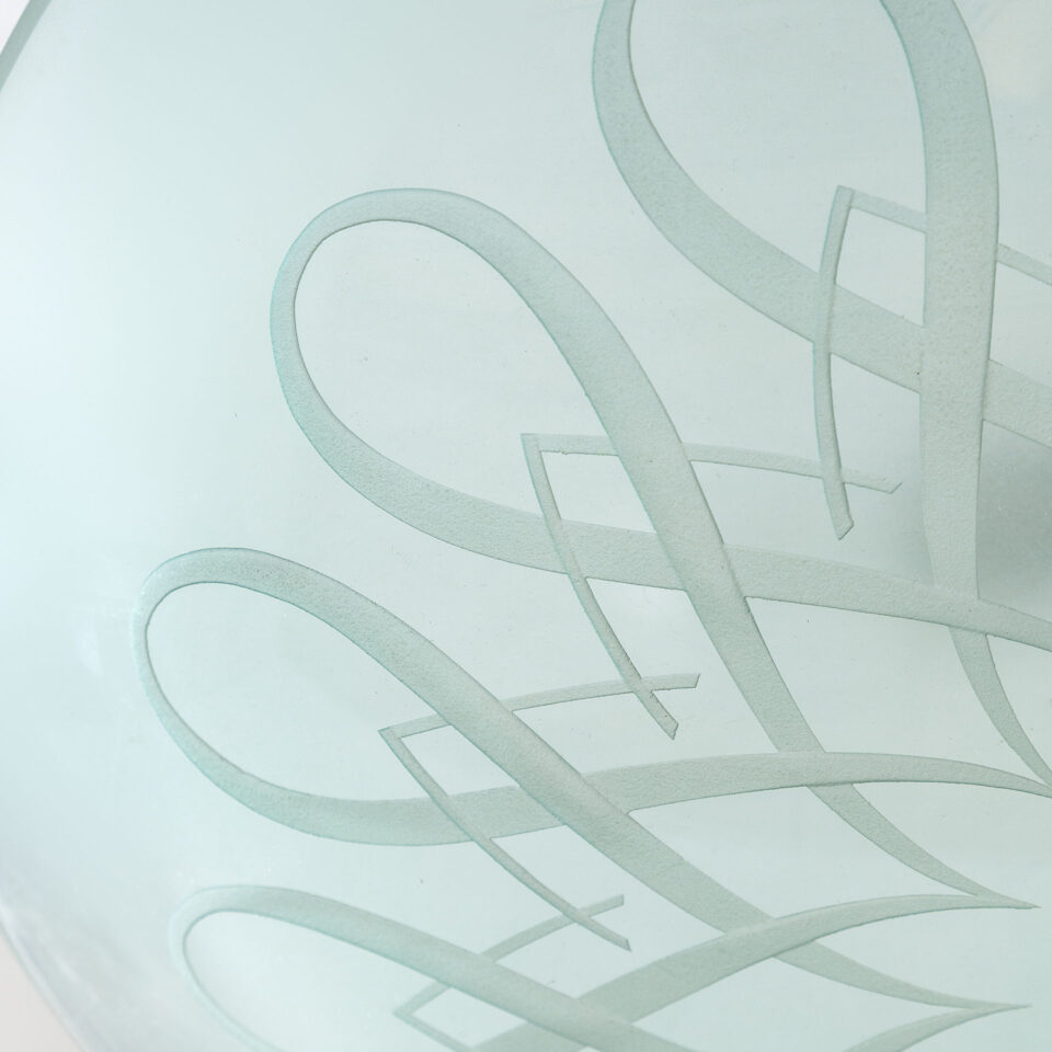 Lampada a sospensione, struttura in ottone con diffusore in cristallo curvato di Gio Ponti per Fontana Arte