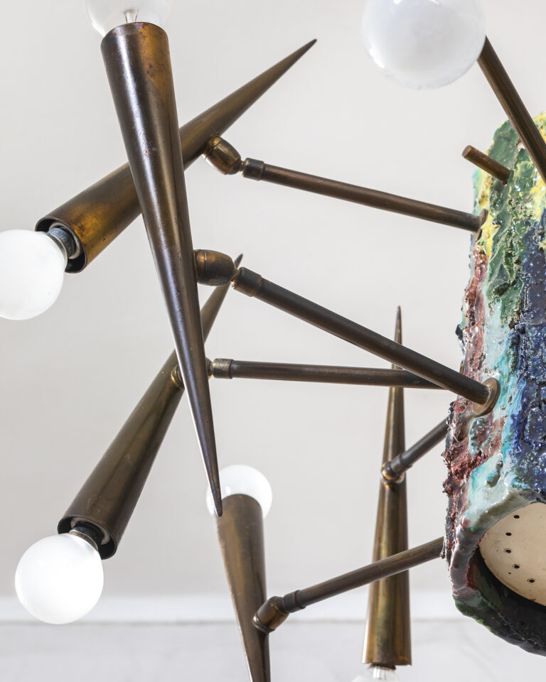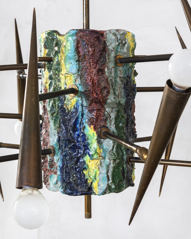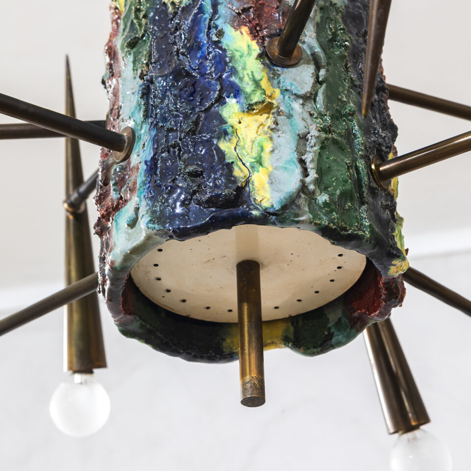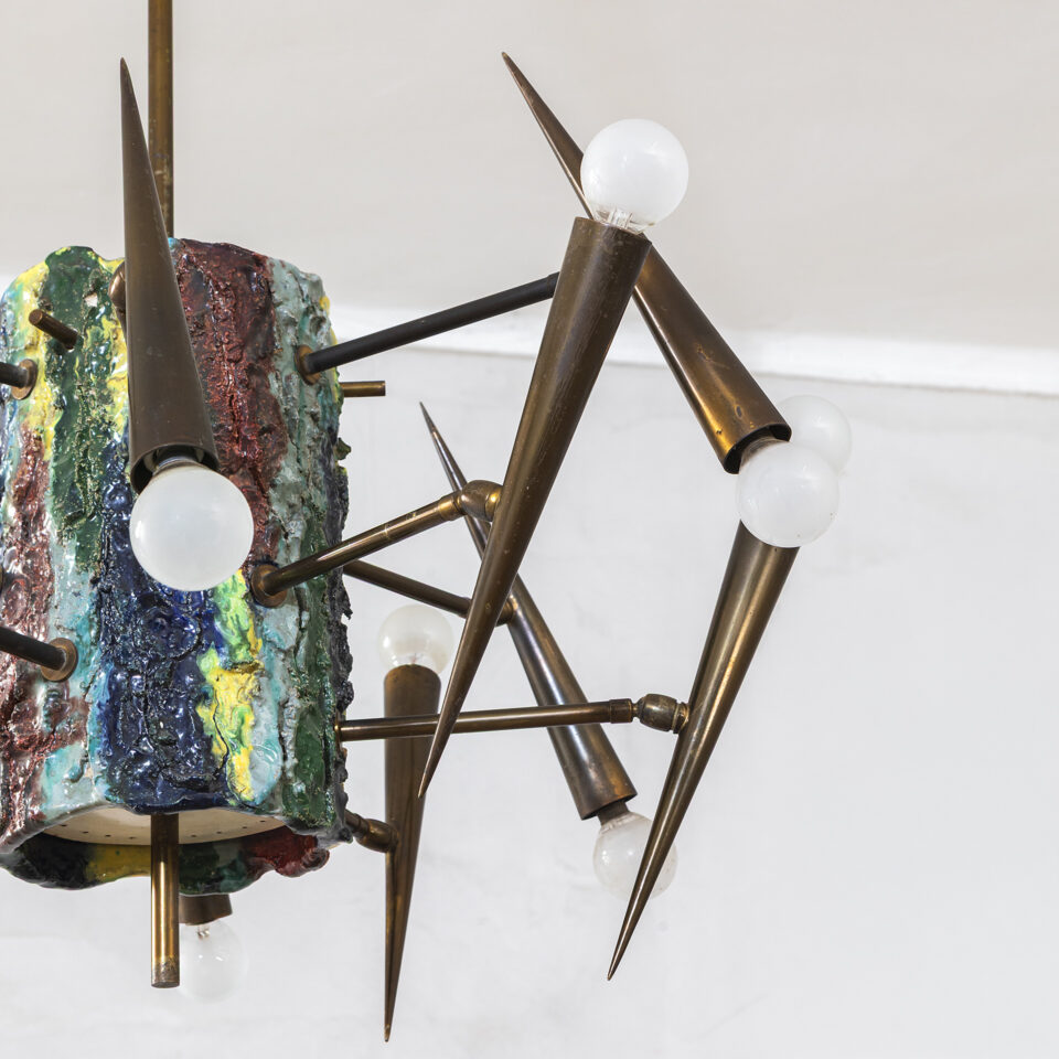 Lampada a sospensione, struttura in ottone e ceramica smaltata, disegnata da Leoncillo Leonardi