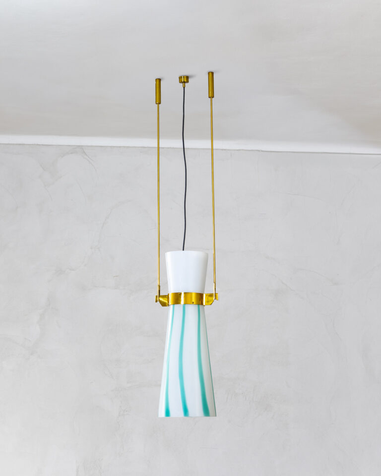 Lampada a sospensione con struttura in ottone e diffusore in vetro colorato disegnato da Studio BBPR