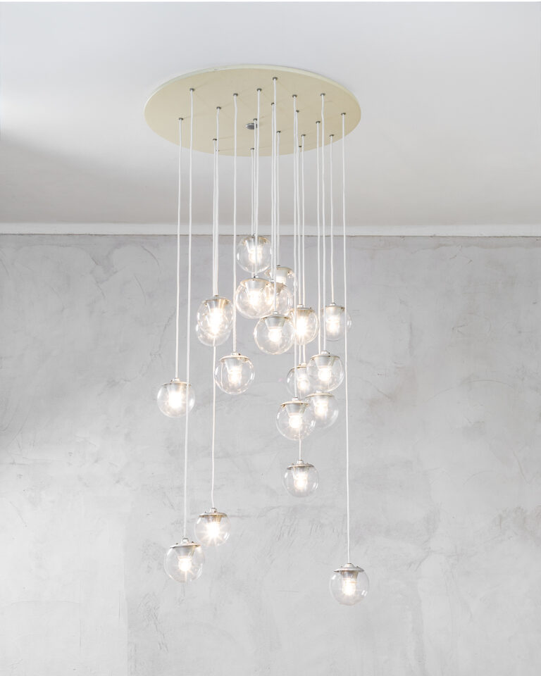 Lampada a sospensione mod. 2095/20, strutta in alluminio lucidato e diffusori in vetro ad altezza regolabile, di Gino Sarfatti per Arteluce