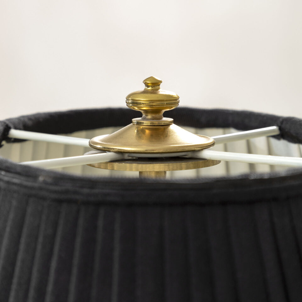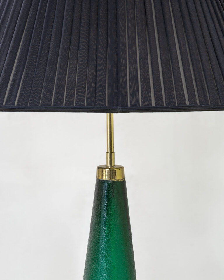 Lampada da tavolo, struttura in ottone e vetro colorato con paralume in tessuto, disegnata da Paolo Venini