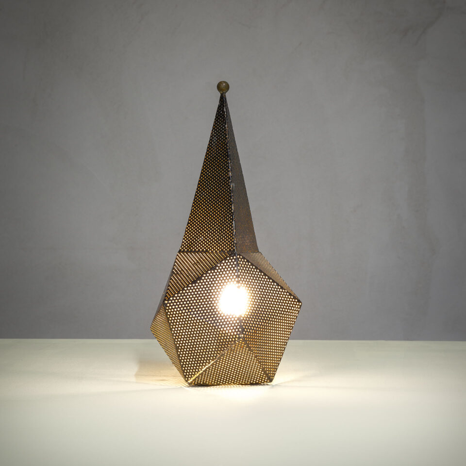 Lampada da tavolo mod. Baghdad in metallo forato e laccato, particolare in ottone, disegnata da Mathieu Matégot