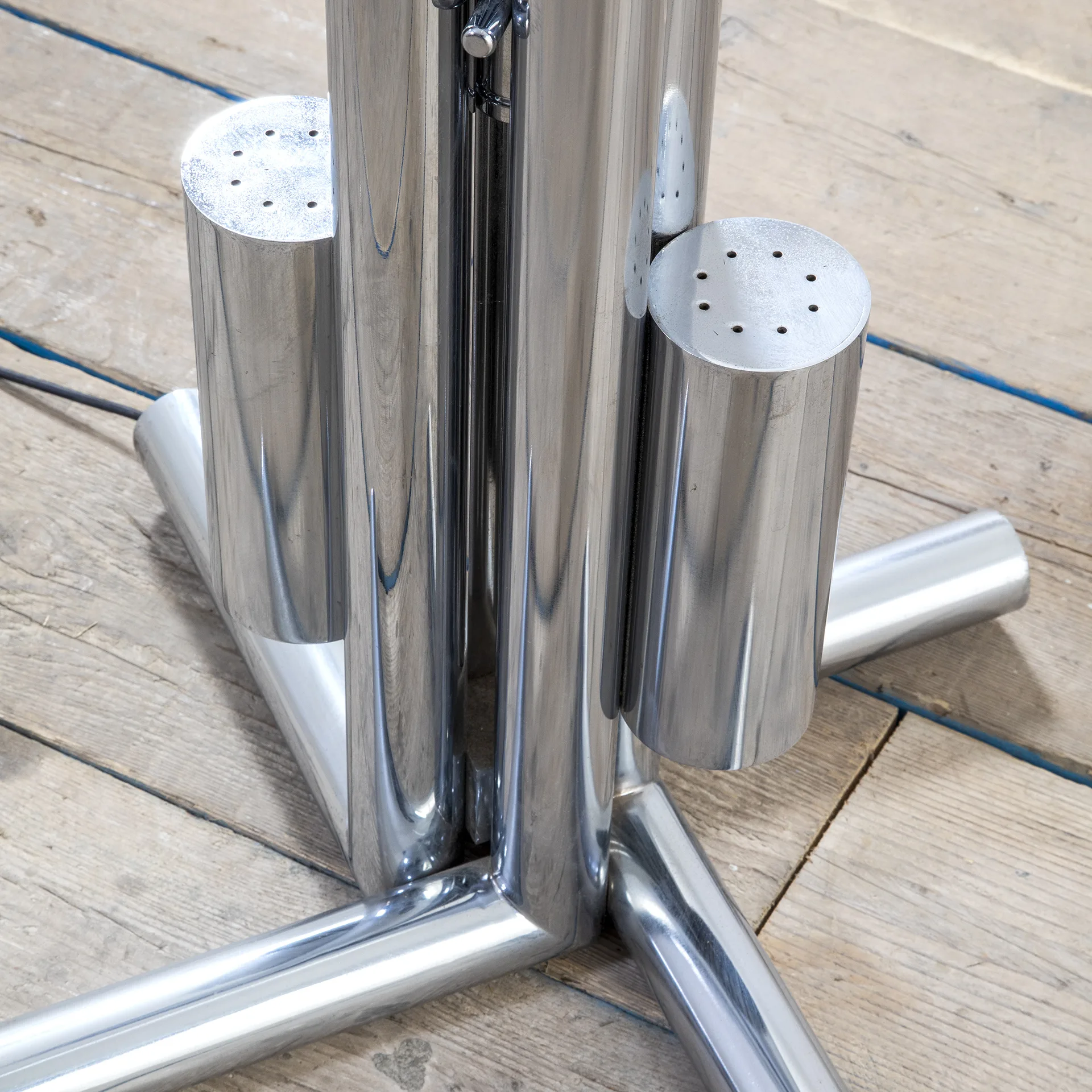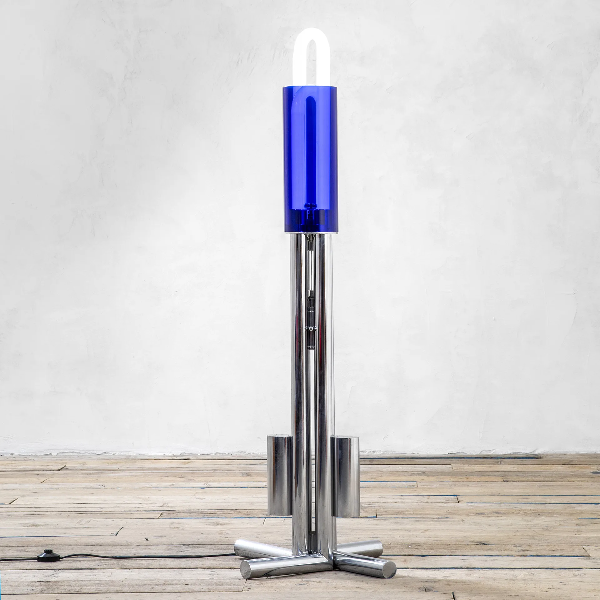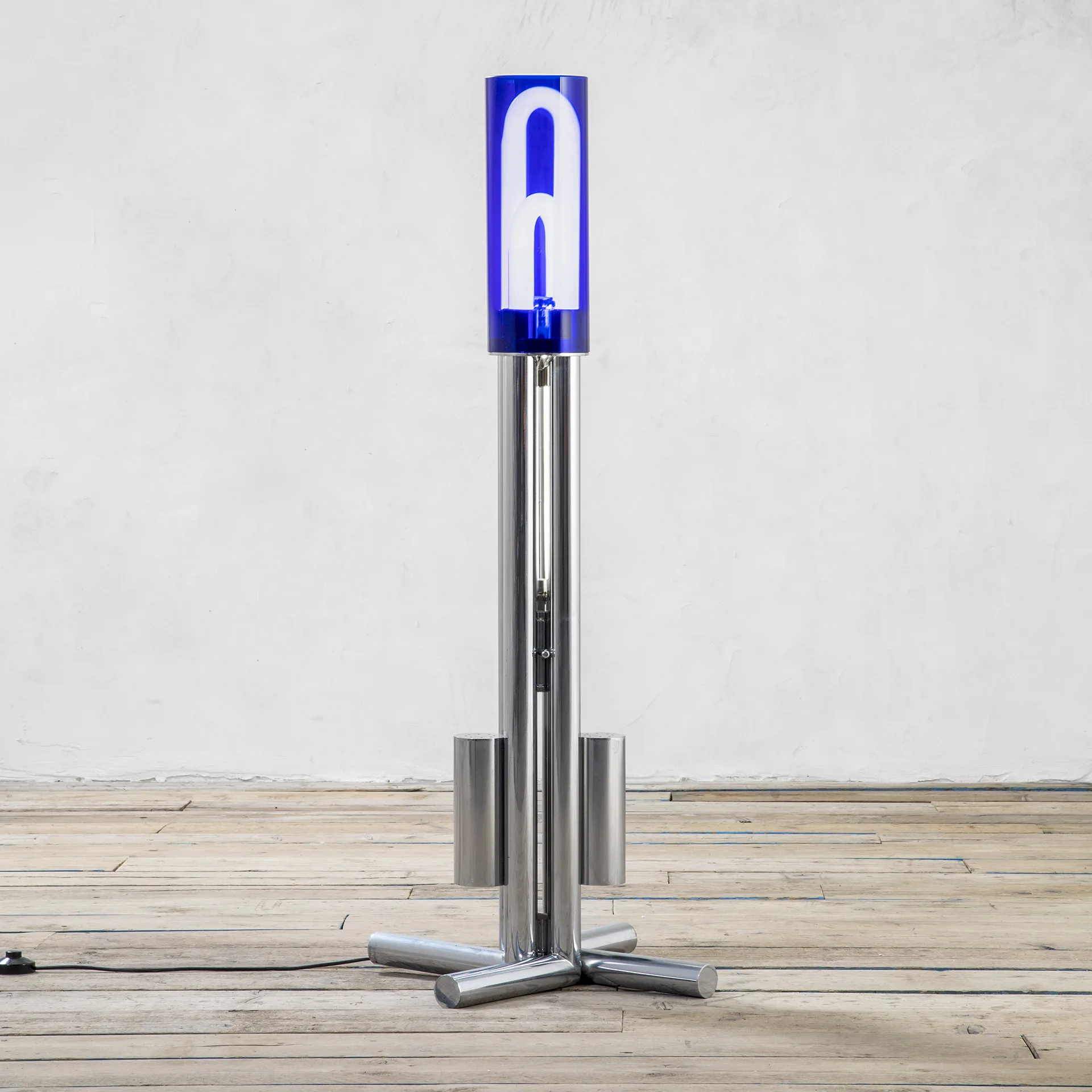 Lampada da terra modello “Tetralogia” di Aimaro Isola e Roberto Gabetti con struttura in metallo cromato e diffusore posizionabile in metacrilato, Produzione Arbo, anni ’70