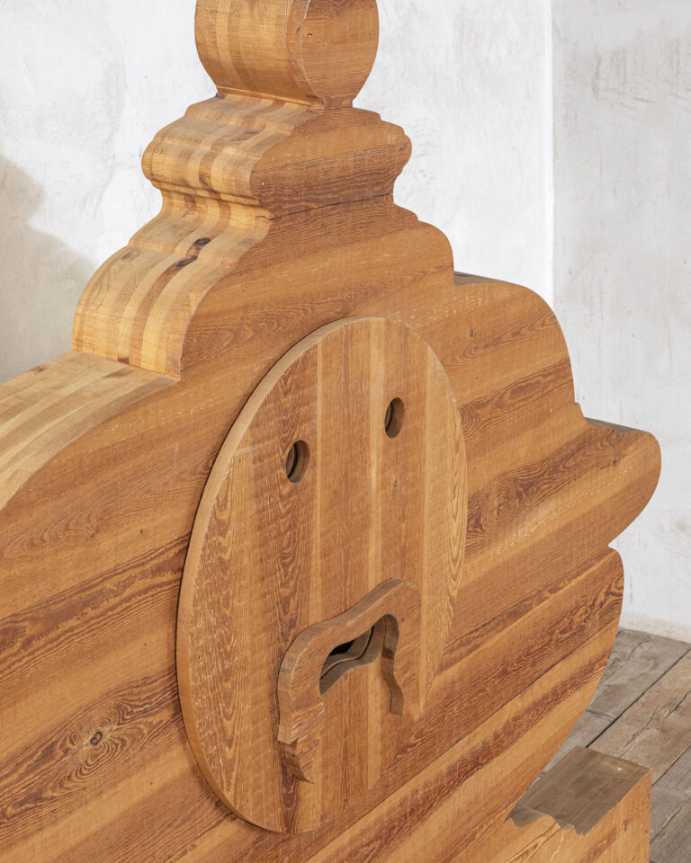 Letto mod. Bocca della Verità, struttura interamente in legno, disegnato da Mario Ceroli per Poltronova