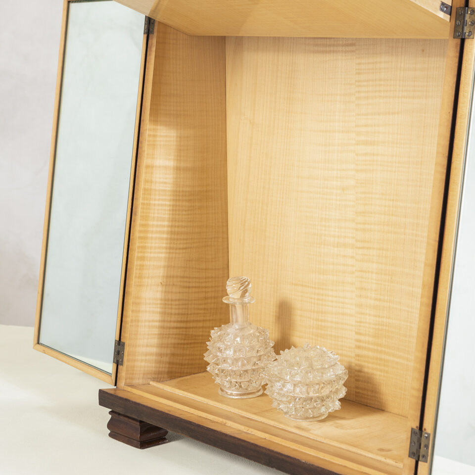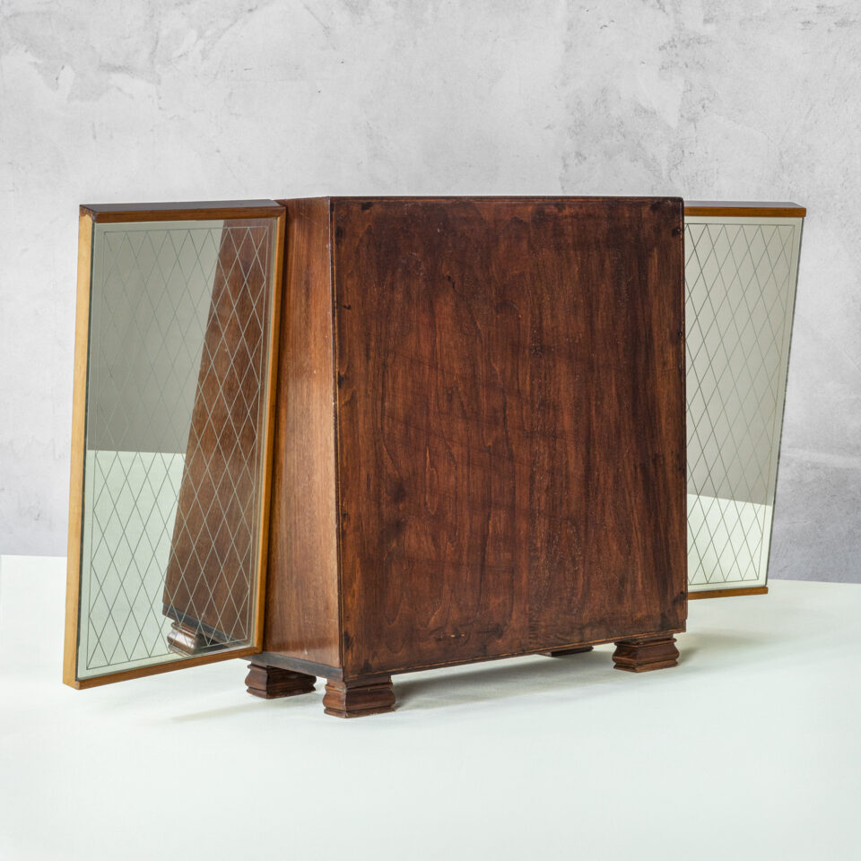 Mobile bar, struttura in legno e ante con rivestimenti in cristallo con decoro inciso, disegnato da Pietro Chiesa per Fontana Arte