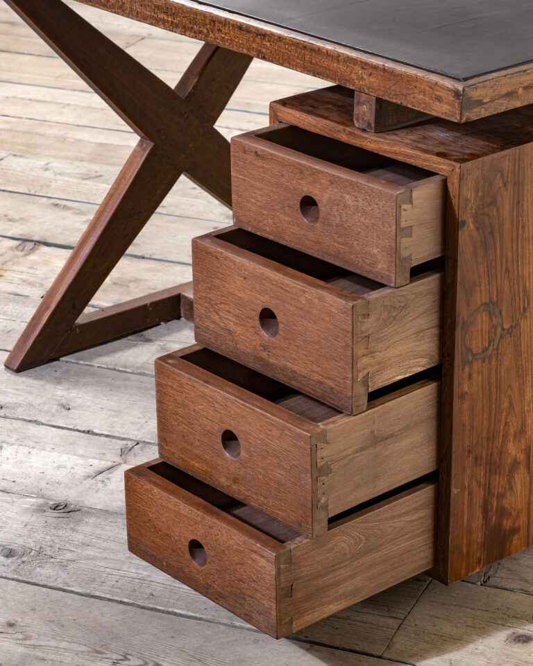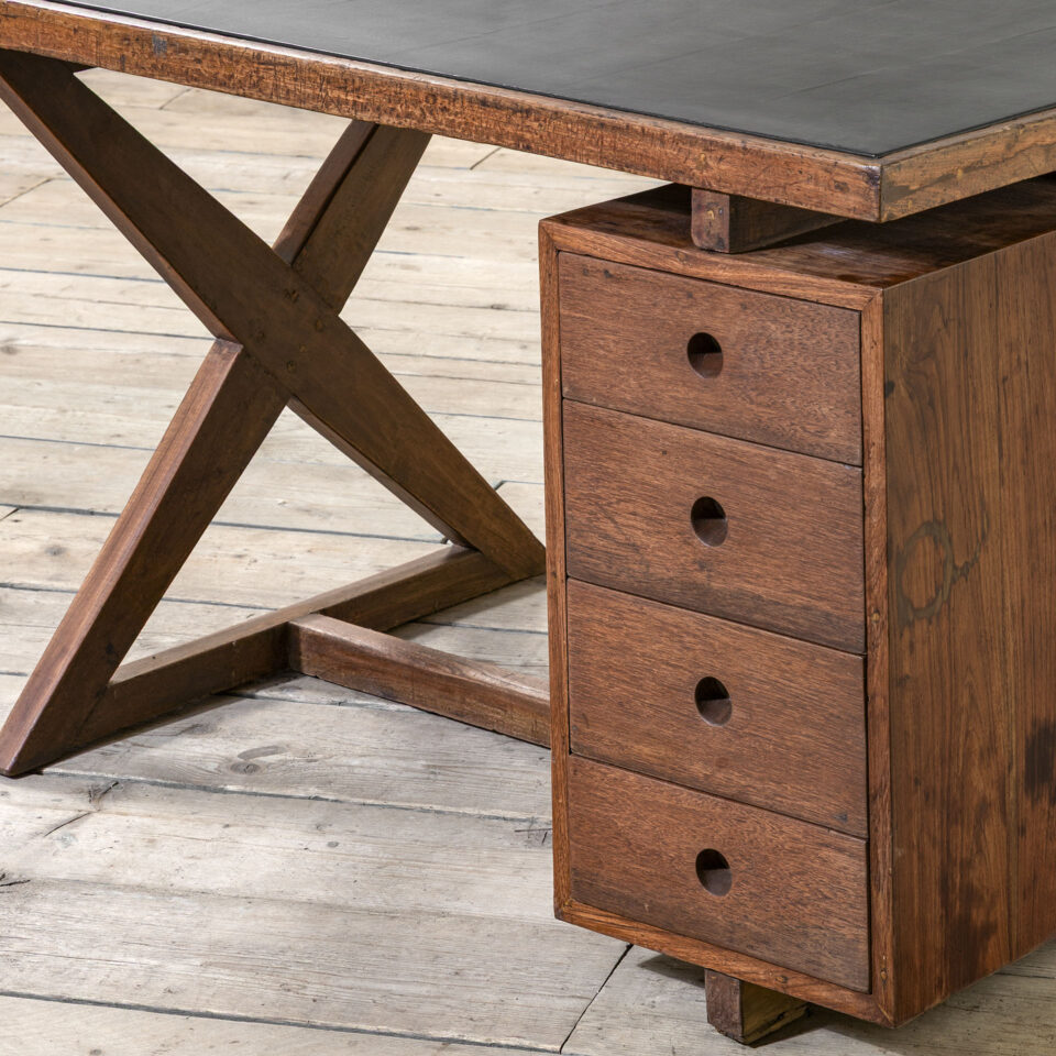 Scrivania mod. PJ-030405, struttura e piano in legno con rivestimento in pelle, disegnata da Pierre Jeanneret per i locali dell’Università del Punjab e locali amministrativi a Chandigarh