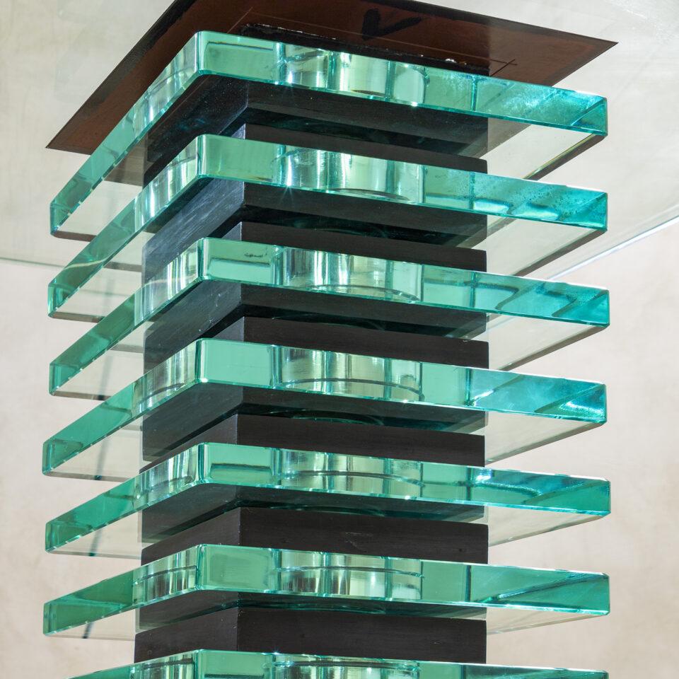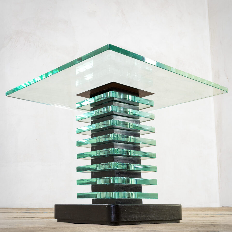 Tavolo con struttura in legno e piani in cristallo molato di Pietro Chiesa per Fontana Arte